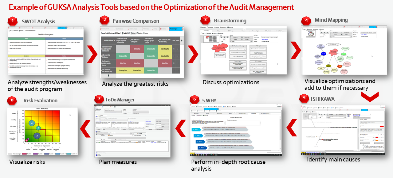 ANALYSIS 的目的是在数据技术方面以整体和系统的方式将不同的工具联系在一起,而无需重新输入单个分析的结果。例如,可以使用 GUKSA 工具 ANALYSIS 将头脑风暴与思维导图结合起来,然后进行配对比较,以确定最重要的因素;也可以使用石川工具进行更深入的分析,只需按一下按钮,就可以进一步处理相应的评估,描绘因果关系,例如在风险图中创建机遇/风险。