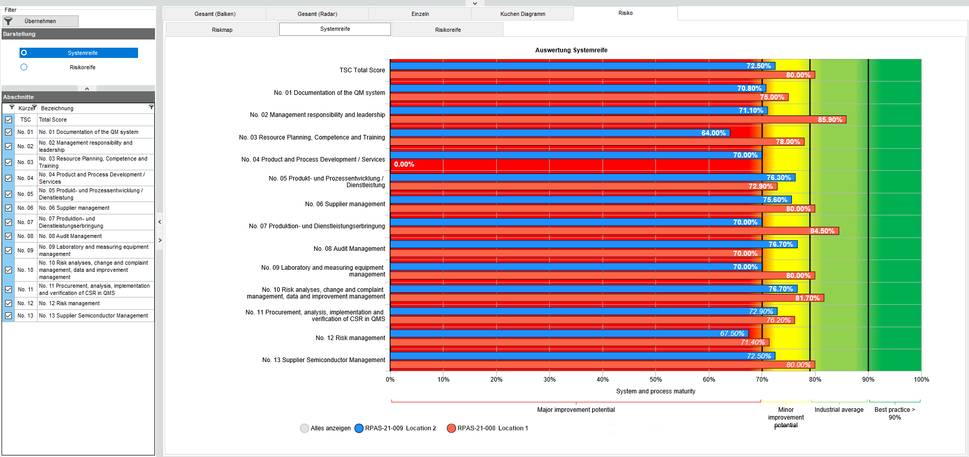 AUDiT 可以快速、条理清晰地将所进行的审核总结成报告,并传达给参与审核的人员。审计评估的基础是确定在审计中达到/确定的绩效水平。主要创新之处在于将公司整体存在的风险纳入其中。