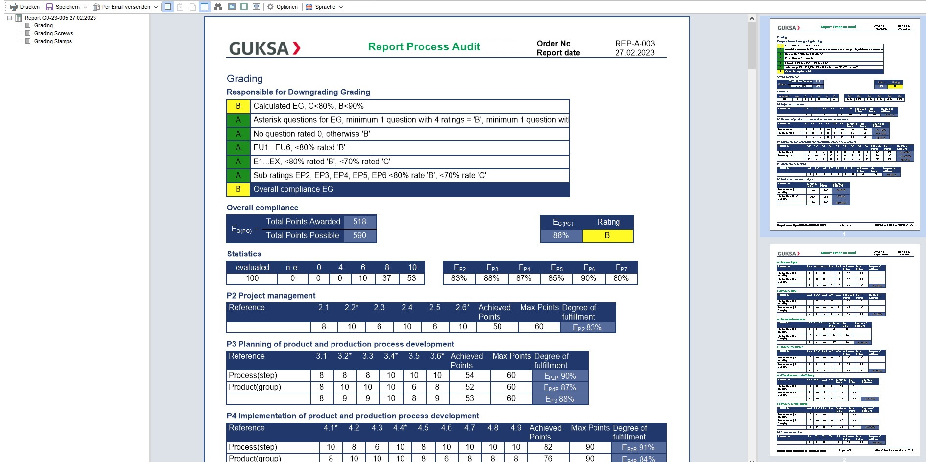 友好的用户界面>GUKSA PAS-P BASIC/PRO 软件使用户能够按照规定进行流程审核,并辅以说明。在搜索功能的帮助下,您可以轻松找到审计信息和由此得出的措施,然后使用统计和报告功能将其清晰地显示出来,比较结果并打印成报告,以便根据需要进行共享。