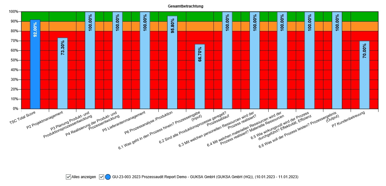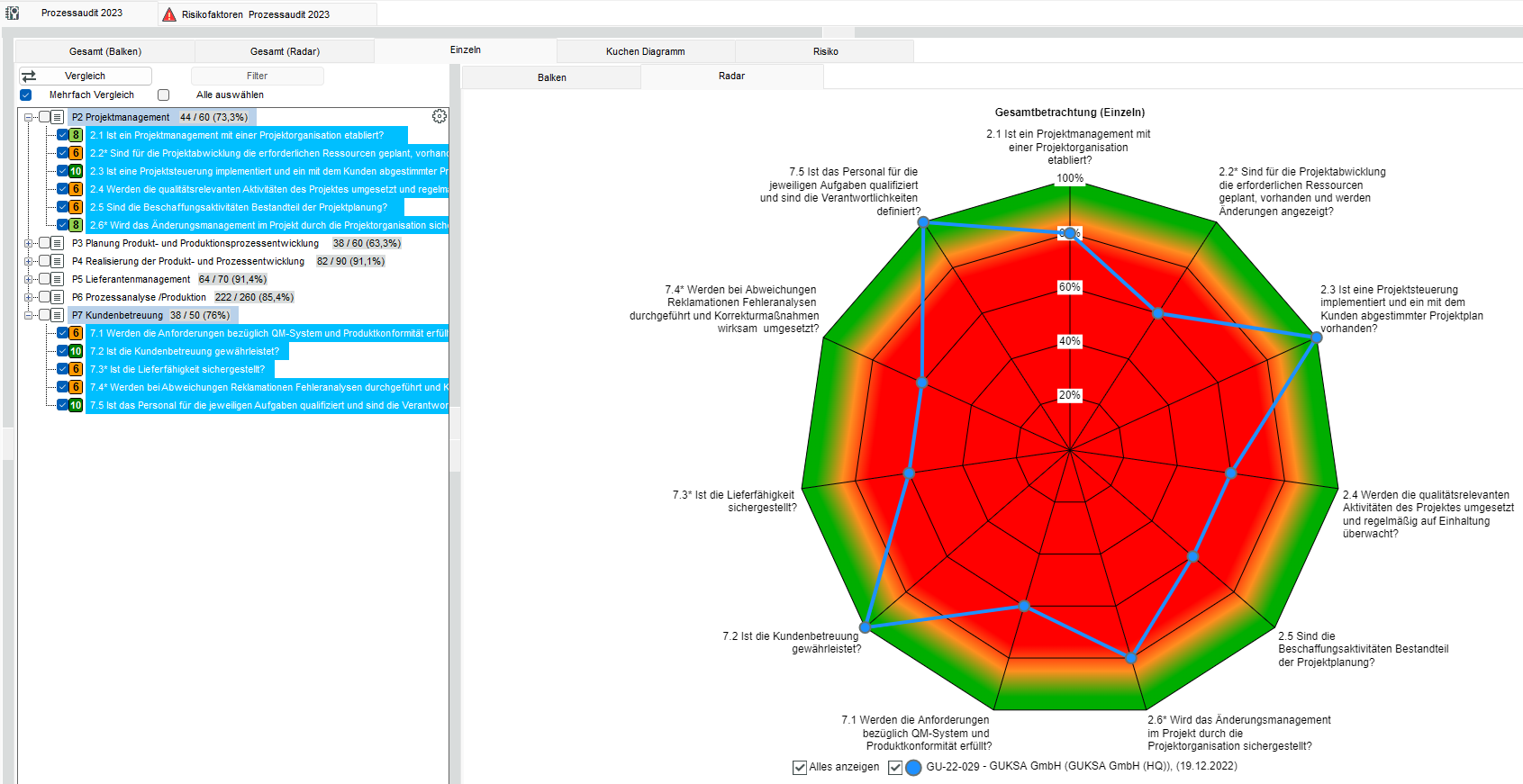 随着>在 GUKSA PAS-P PRO 风险方法中,您可以分配相应的风险因素/权重,例如星号问题或与流程相关的特定客户应收账款,如 CpK 应收账款。除了流程审核所需的结果和评估规则外,总体结果还显示了对流程的深入评估,同时考虑到了客户的具体要求及其风险和机遇。系统地展示流程审核的完成情况,还能为管理层提供风险地图,以规划和跟踪有针对性的措施。